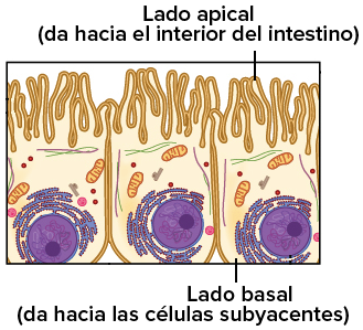 Las células epiteliales están polarizadas, lo que significa que tienen un lado superior y uno inferior. El lado apical, superior, de una célula epitelial da hacia el interior de una cavidad o el exterior de una estructura y generalmente está expuesta a líquido o aire. El lado basal, inferior, da hacia las células subyacentes. Por ejemplo, el lado apical de las células intestinales tienen estructuras en forma de dedos que aumentan la superficie con la que absorben nutrientes.