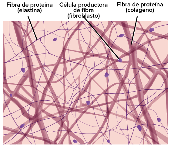 El tejido conectivo laxo, que se muestra más adelante, es el tipo más común de tejido conectivo. Se encuentra por todo tu cuerpo y soporta órganos y vasos sanguíneos, además de unir los tejidos epiteliales de los músculos subyacentes. El tejido conectivo denso o fibroso, se encuentra en tendones y ligamentos, los cuales conectan músculos con huesos y huesos con otros huesos, respectivamente.